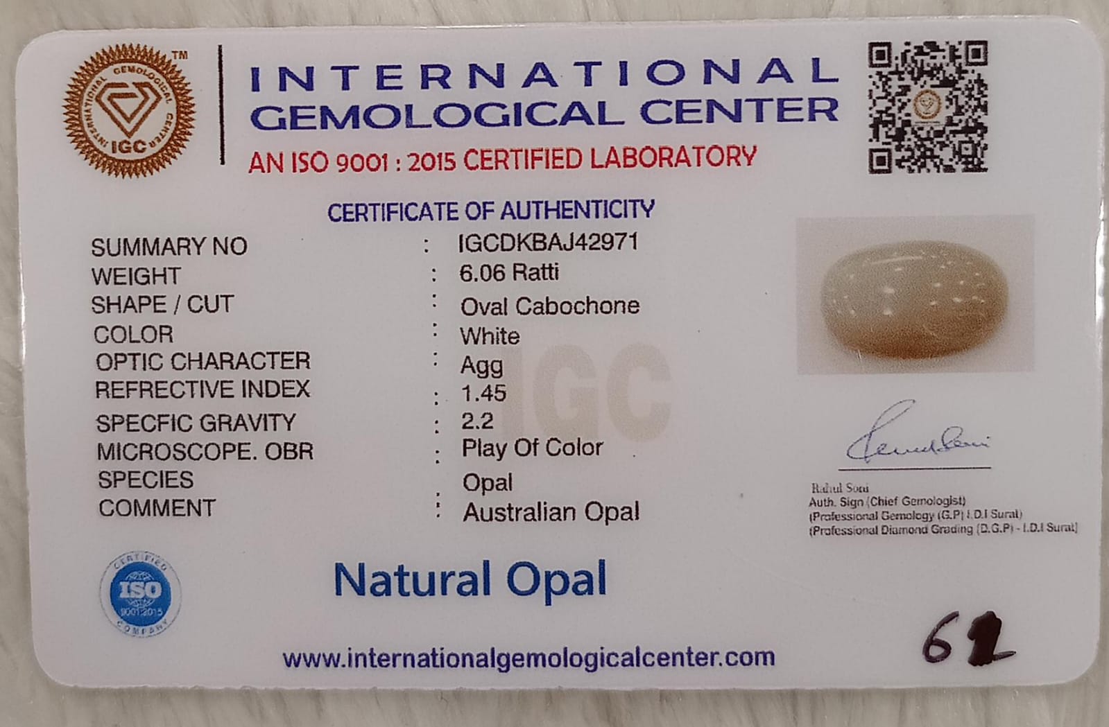 Natural White Opal 6.06Ra...Natural White Opal 6.06Ratti| Oval Cabochone | Certified No. IGCDKBAJ42971