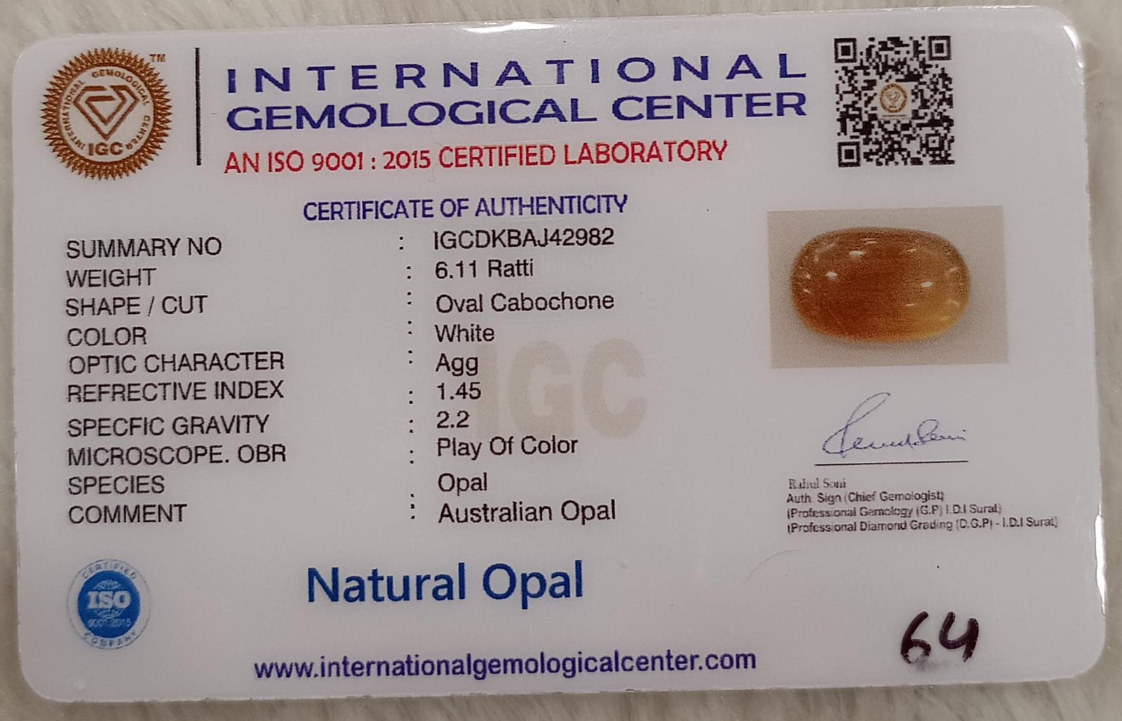 Natural White Opal 6.06Ra...Natural White Opal 6.11Ratti| Oval Cabochone | Certified No. IGCDKBAJ42982