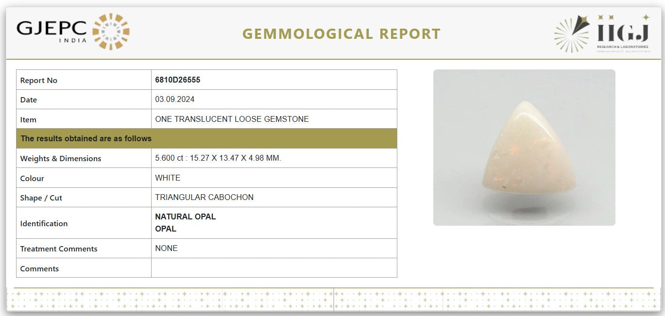 A rare and elegant triangular cabochon cut opal, this 5.60 carat white gemstone displays a luminous, milky translucence with scattered flashes of internal color. Its unique shape makes it especially attractive for statement jewelry. Fully certified as a natural, untreated opal by IIGJ Laboratories.
