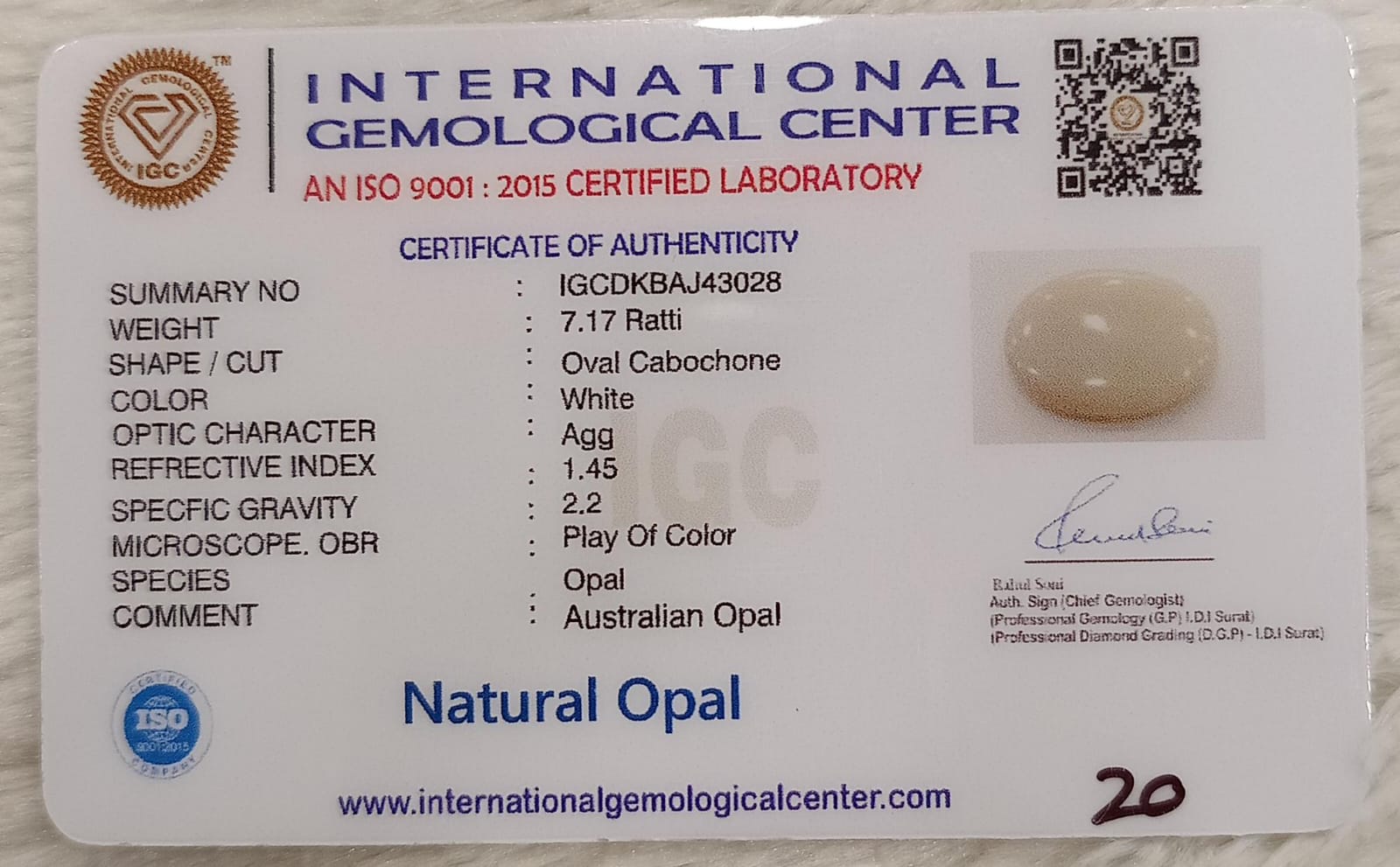 Natural White Opal 7.17 Rat...Natural White Opal 7.17 Ratti| Oval Cabochone | Certified No. IGCDKBAJ43028