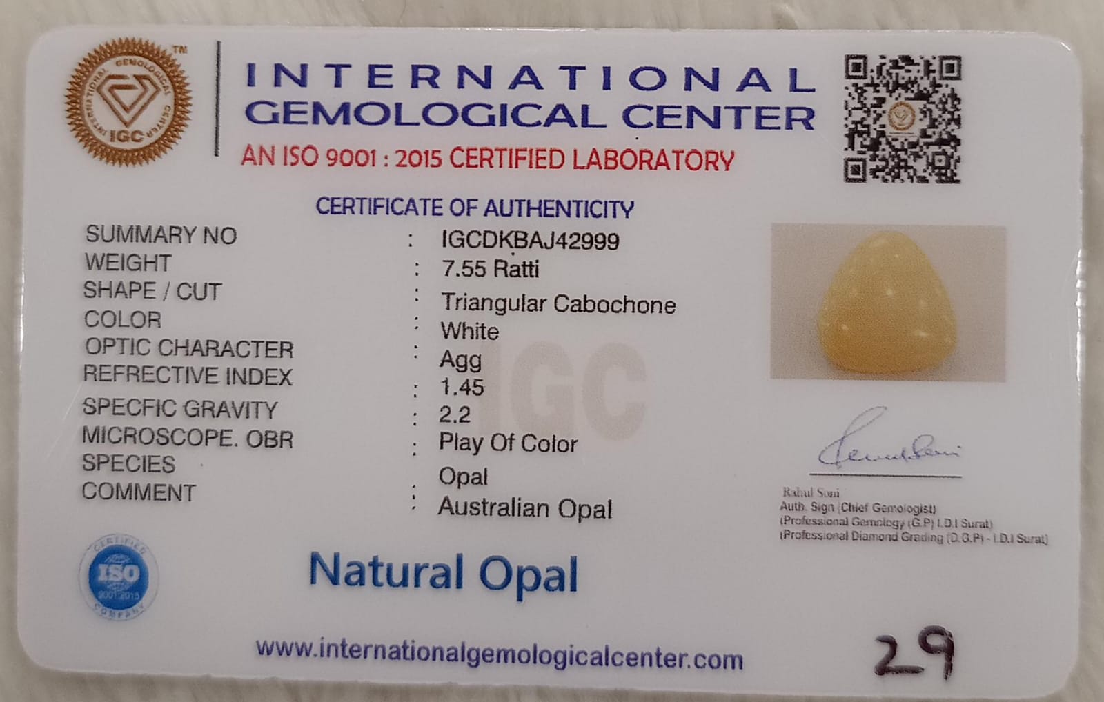 Natural White Opal 7.50 Rat...Natural White Opal 7.55Ratti| Triangular Cabochone | Certified No. IGCDKBAJ42999