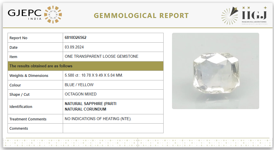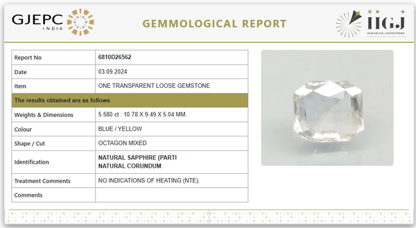Introducing a rare Natural Parti Sapphire with an elegant play of blue and yellow tones, combining both mystique and charm in one stunning gem. With a weight of 5.580 Carat / 6.20 Ratti, this stone is cut in a sophisticated Octagon Mixed shape, offering a perfect balance between classic lines and modern brilliance.