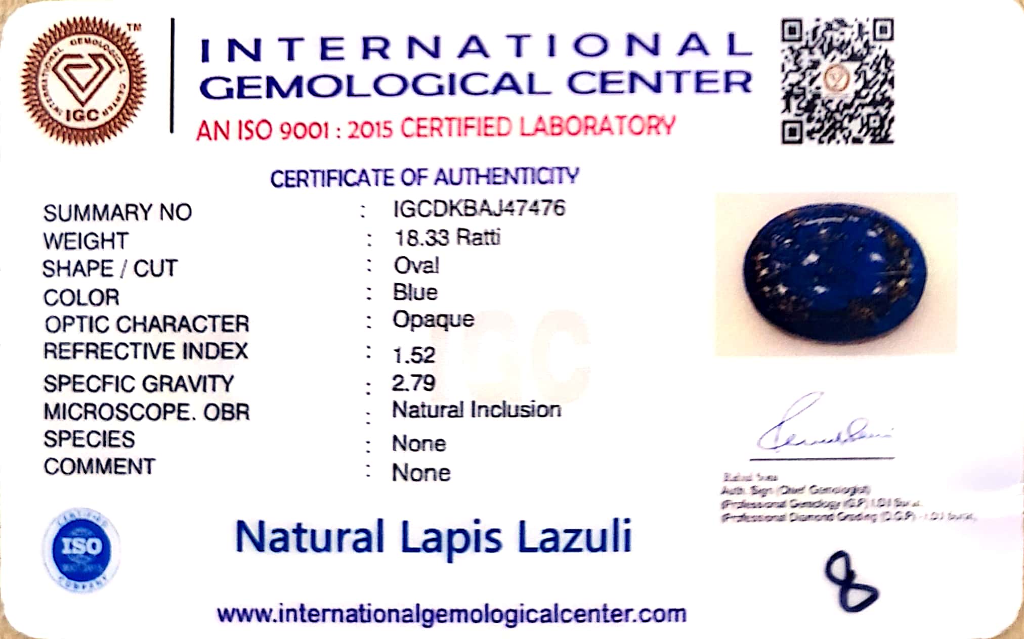 Natural Lapis Lazuli |Gov...Natural Lapis Lazuli | Certified Oval Cut | Deep Blue with Natural Inclusions Certificate No.: IGCDKBAJ47476