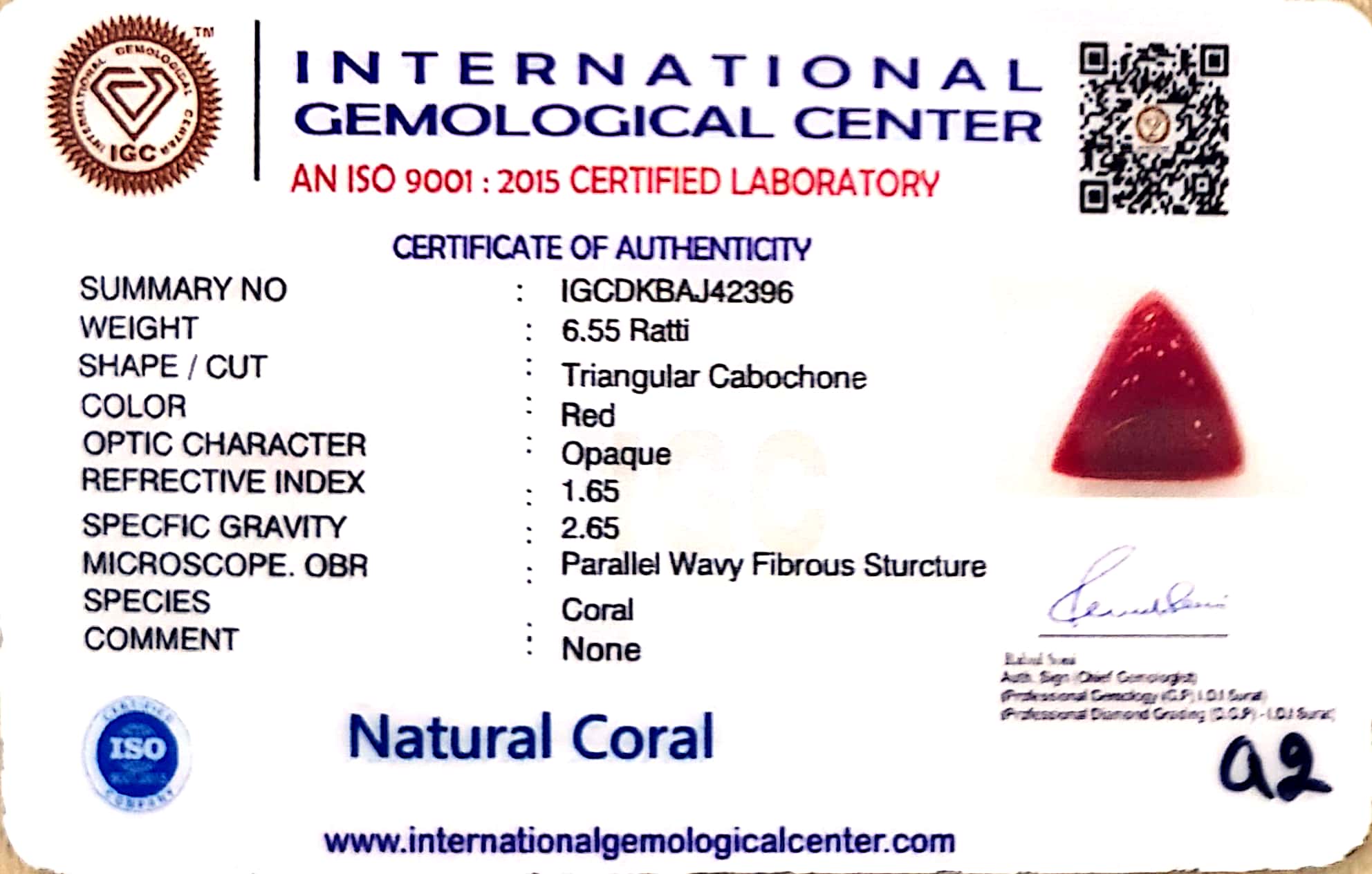Introducing a Natural Red Coral weighing 6.55 Ratti , lab-certified by the International Gemological Center (IGC). This gem features a traditional Triangular Cabochon shape with a vibrant red color and completely untreated composition.