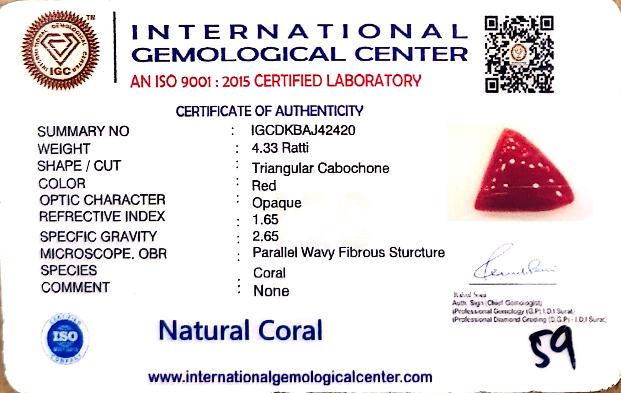 Introducing a premium-quality Natural Red Coral weighing 4.33 Ratti (3.920 Carat)—perfect for Vedic astrology and spiritual well-being. This coral is certified by the International Gemological Center (IGC) and is completely untreated, ensuring its natural authenticity.