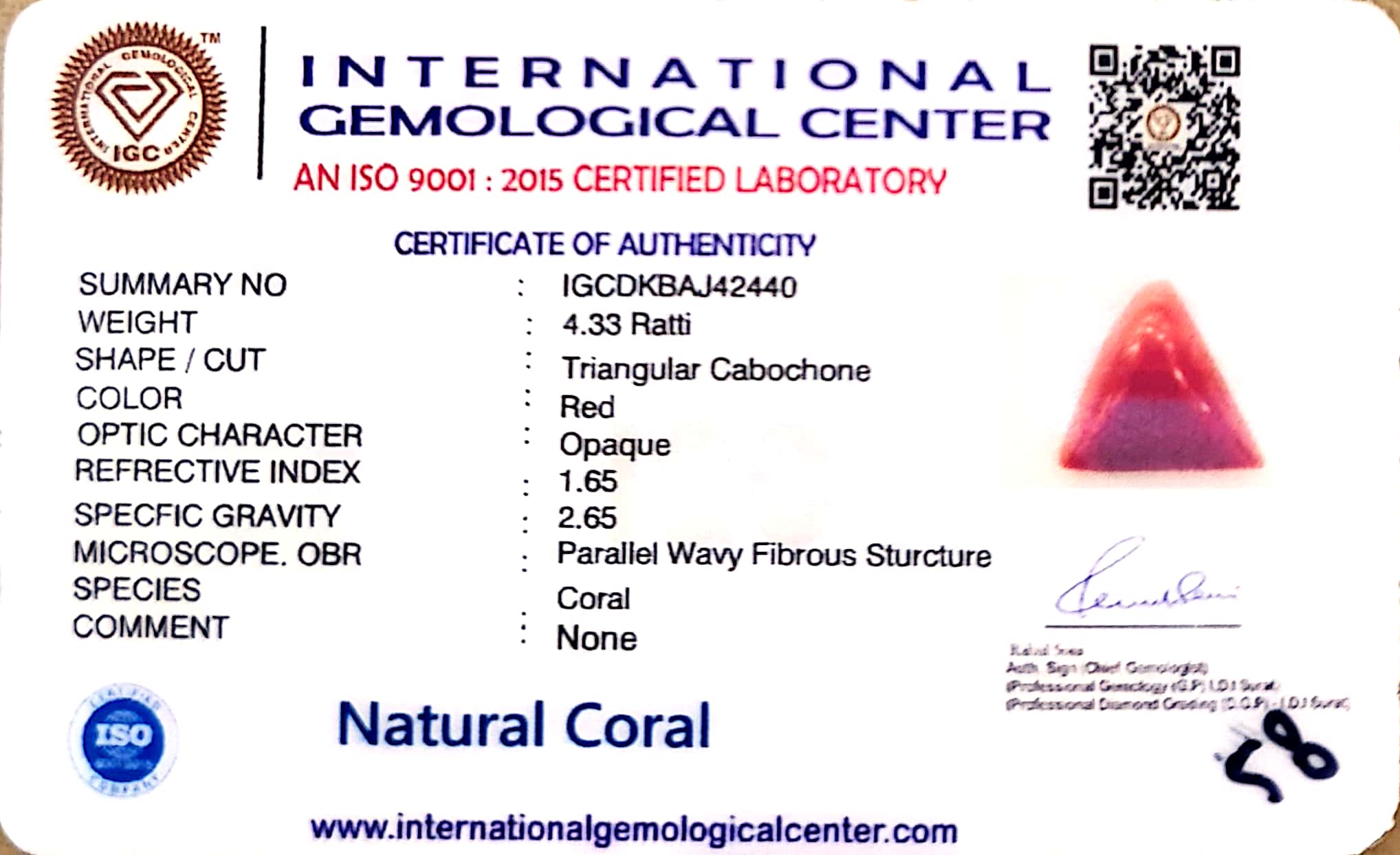 Presenting a naturally vibrant Red Coral weighing 4.33 Ratti (3.920 Carat)—a powerful gemstone known for its astrological and healing benefits. Certified by the International Gemological Center (IGC), this coral is untreated and retains its original organic properties.