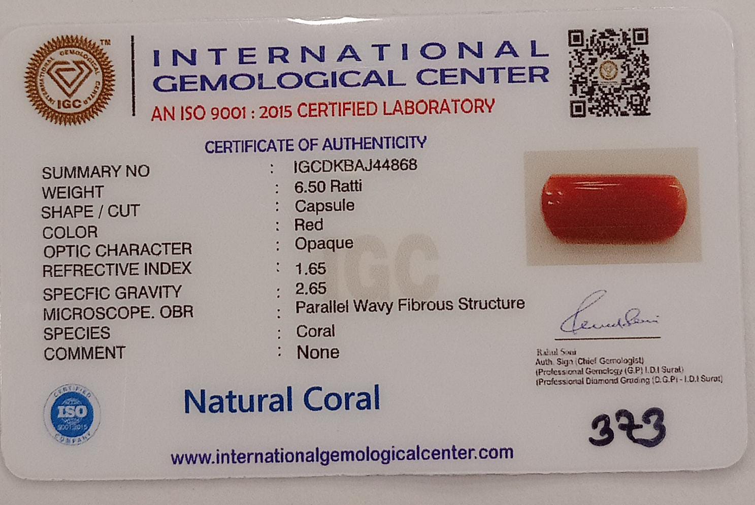 This Natural Red Coral, weighing 6.50 Ratti (5.85 Carat), is a certified gemstone ideal for astrological and spiritual benefits. With a Capsule cut and a rich red hue, this coral is 100% natural and untreated, verified by the International Gemological Center (IGC).