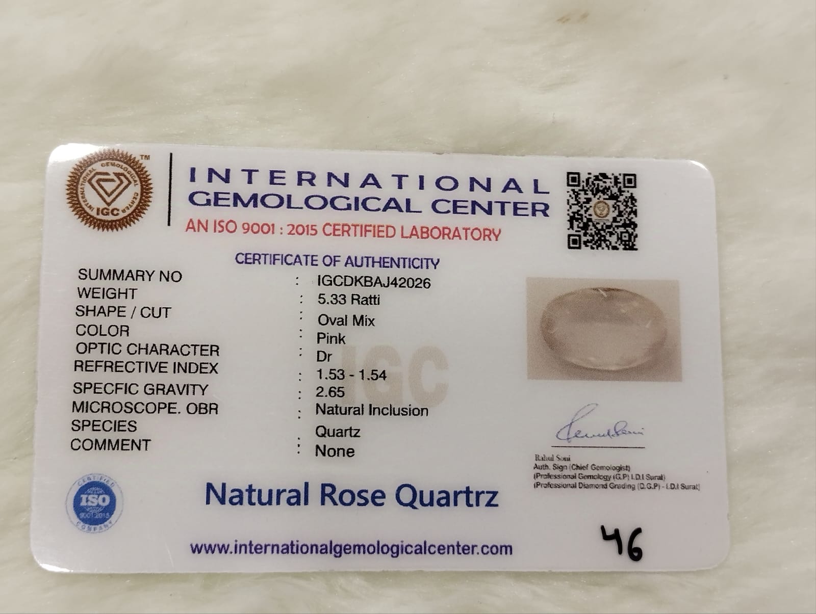 At Tushar Gems, we take pride in offering the finest quality gemstones, and our 5.33 Ratti Natural Rose Quartz is no exception. Carefully sourced and ethically obtained, this gemstone is selected for its beautiful color, clarity, and positive energy. Each piece is crafted with attention to detail, ensuring that it meets the highest standards of quality. Whether you’re looking to enhance your gemstone collection, explore the healing properties of Rose Quartz, or gift it to a loved one, the 5.33 Ratti Natural Rose Quartz is a timeless choice. Experience the calming energy and universal love this gemstone has to offer and make it a cherished part of your life today.Why Tushar Gems?