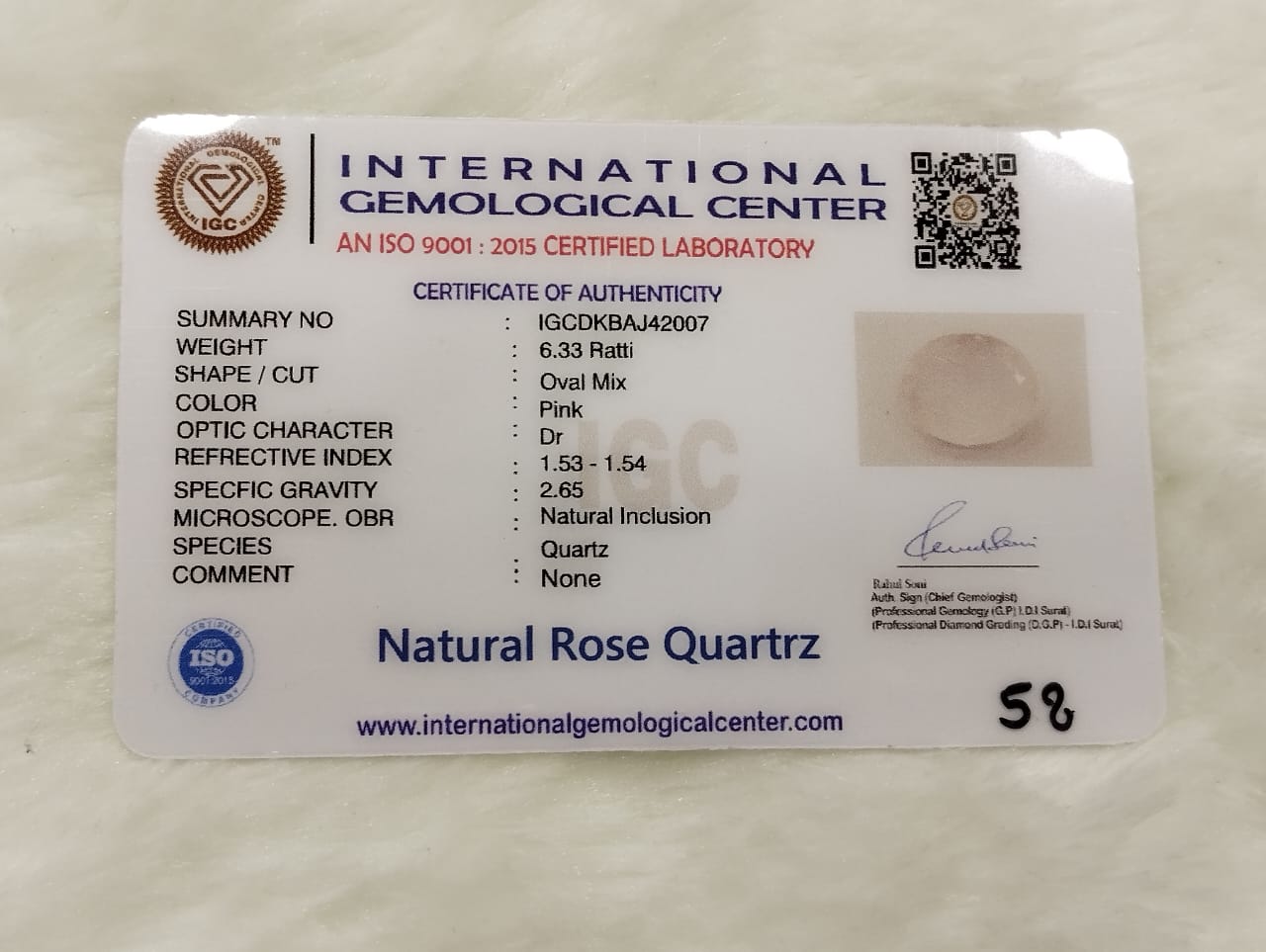 The 6.33 Ratti Natural Rose Quartz stands out with its delicate pink color, which is attributed to the presence of trace amounts of titanium, iron, or manganese in the stone. This gemstone is often chosen for its serene appearance and its symbolism of love, compassion, and kindness. The soft, translucent pink is versatile and complements various jewelry designs, making it a popular choice for those seeking both aesthetic appeal and spiritual benefits. This gemstone’s natural beauty is perfect for rings, pendants, earrings, and bracelets, offering an elegant touch to any jewelry piece. The 6.33 Ratti size is ideal for those who prefer a moderate yet impactful gemstone in their jewelry collection.Emotional and Spiritual Benefits of 6.33 Ratti Natural Rose Quartz