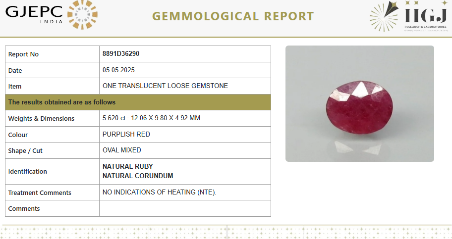Discover this premium-quality Natural Ruby, weighing 6.24 Ratti (5.620 Carat), certified by IIGJ Research & Laboratories. This vibrant purplish red gemstone is finely cut in an oval mixed shape, ideal for astrological or ornamental use.