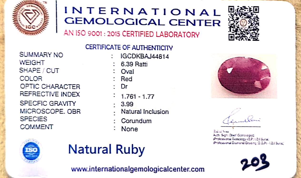 This 6.39 Ratti Natural Ruby has been certified by the International Gemological Center (IGC). It is crafted in an Oval cut and exhibits a beautiful Red color. The ruby belongs to the Corundum species and features Natural Inclusions, confirming its authenticity and natural origin.