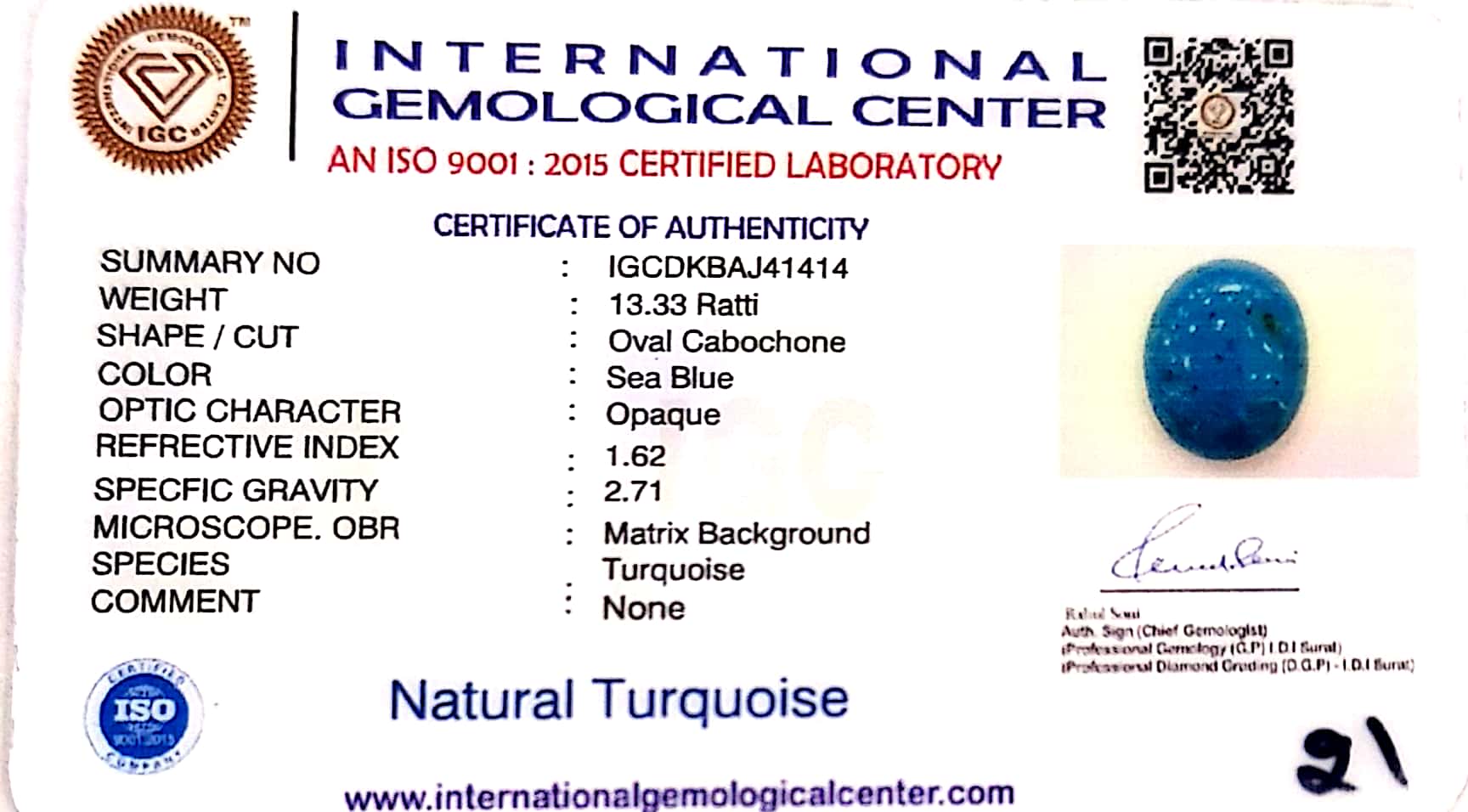 This 13.33 Ratti Natural Turquoise gemstone is beautifully shaped in an oval cabochon cut, showcasing a rich sea blue hue with natural matrix inclusions. Its opaque character and certified origin from the International Gemological Center (IGC) ensure authenticity and high astrological value.