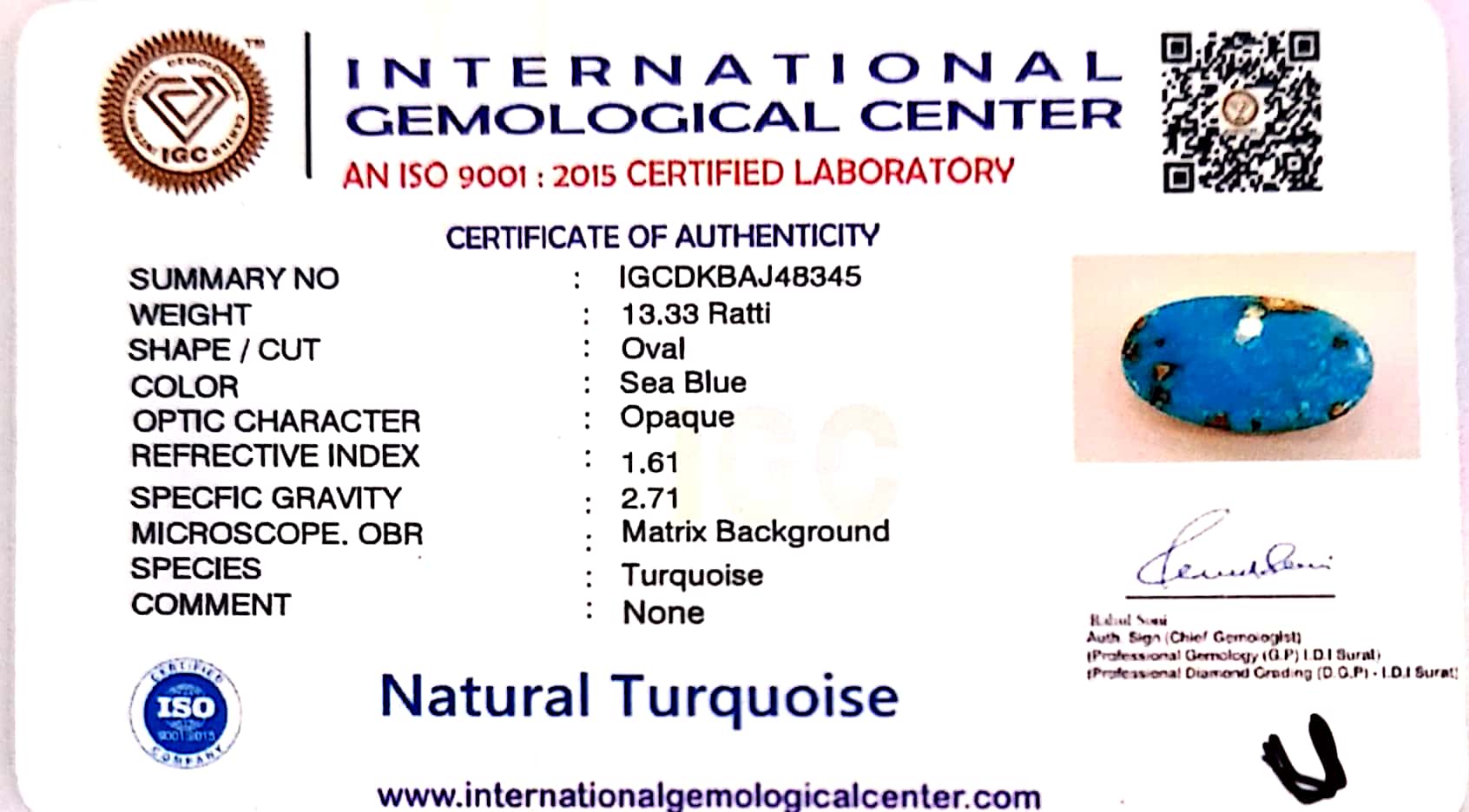 This 13.33 Ratti Natural Turquoise gemstone features a striking sea blue color with a natural matrix background. It is expertly cut into an oval shape and has an opaque optic character, making it perfect for astrological and spiritual purposes. The stone is certified by the International Gemological Center (IGC) — an ISO 9001:2015 Certified Laboratory.