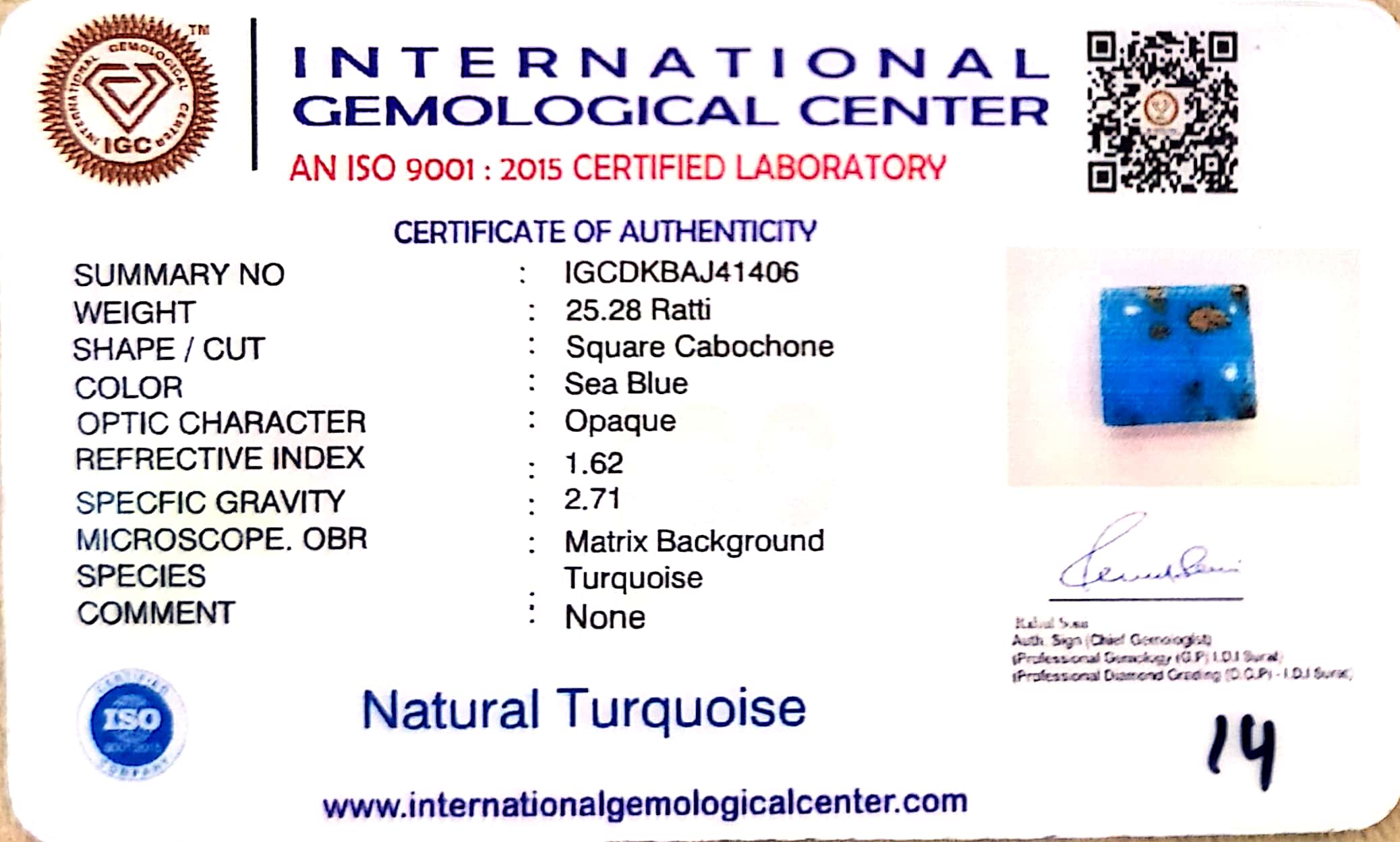This 25.28 Ratti Natural Turquoise gemstone features a striking square cabochon cut with a vivid sea blue body and natural matrix inclusions. Authenticated by the International Gemological Center (IGC), this high-weight piece is ideal for those seeking strong astrological energy and spiritual protection.