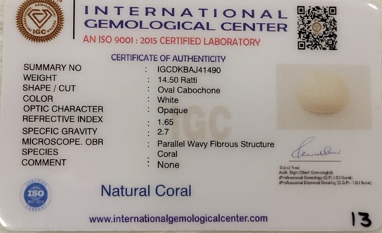 In Vedic astrology, white coral is associated with the planet Mars (Mangal). Mars is known as the planet of strength, courage, and determination, and wearing white coral is believed to balance the effects of this powerful planet. It is often recommended for individuals who have a weak or negatively placed Mars in their birth chart. White coral is believed to enhance the wearer’s strength, confidence, and mental clarity. It can help in overcoming fears, enhancing focus, and bringing stability in relationships. It is also considered to have protective properties, shielding the wearer from negative energies and promoting peace and harmony in their life.Benefits of Wearing 14.50 Ratti Natural White Coral