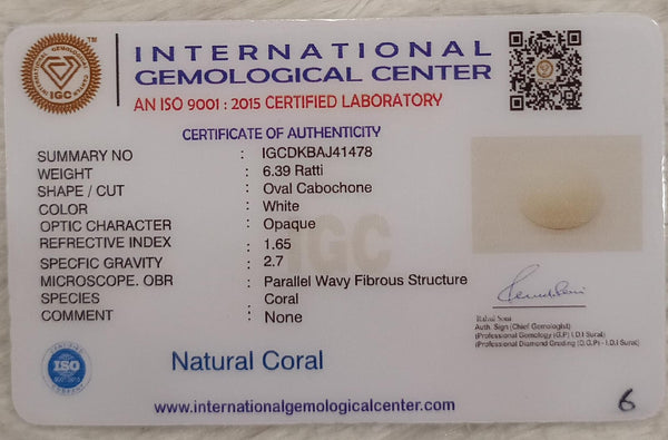 Natural white coral is an organic gemstone formed deep under the ocean by coral polyps. Over time, these marine creatures secrete calcium carbonate, which solidifies and creates the smooth, hard structure of coral. The white coral, with its milky white hue, is highly sought after for both its aesthetic appeal and its astrological importance. The 6.39 Ratti Natural White Coral is particularly valued for its substantial size, making it a remarkable gemstone for those seeking balance, peace, and physical well-being. Its elegant appearance and natural origins add to its timeless charm, making it a versatile choice for a wide range of purposes.Astrological Significance of White Coral