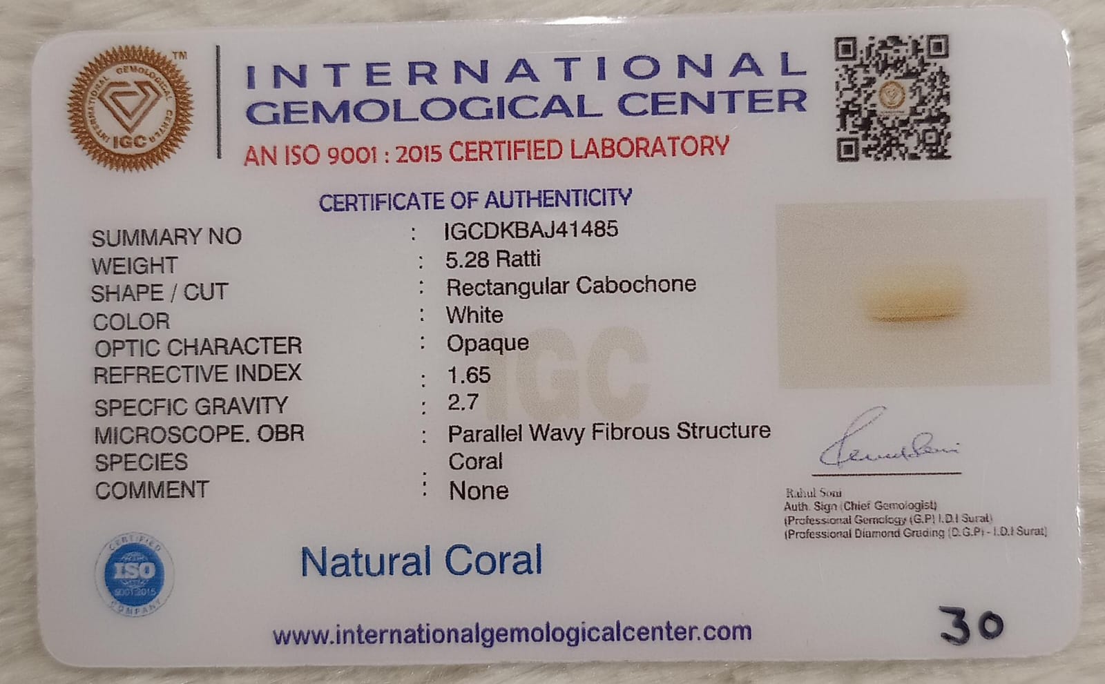 Natural white coral is an organic gemstone formed deep under the ocean by coral polyps. Over time, these marine creatures secrete calcium carbonate, which solidifies and creates the smooth, hard structure of coral. The white coral, with its milky white hue, is highly sought after for both its aesthetic appeal and its astrological importance. The 5.28 Ratti Natural White Coral is particularly valued for its substantial size, making it a remarkable gemstone for those seeking balance, peace, and physical well-being. Its elegant appearance and natural origins add to its timeless charm, making it a versatile choice for a wide range of purposes.Astrological Significance of White Coral
