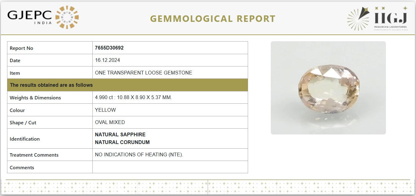 Certified Natural Yellow Sa...Certified Natural Yellow Sapphire (Pukhraj) – 4.990 Carat / 5.55 Ratti | Untreated | Oval Mixed Cut | GJEPC IIGJ Certified | Report No. 7655D30692
