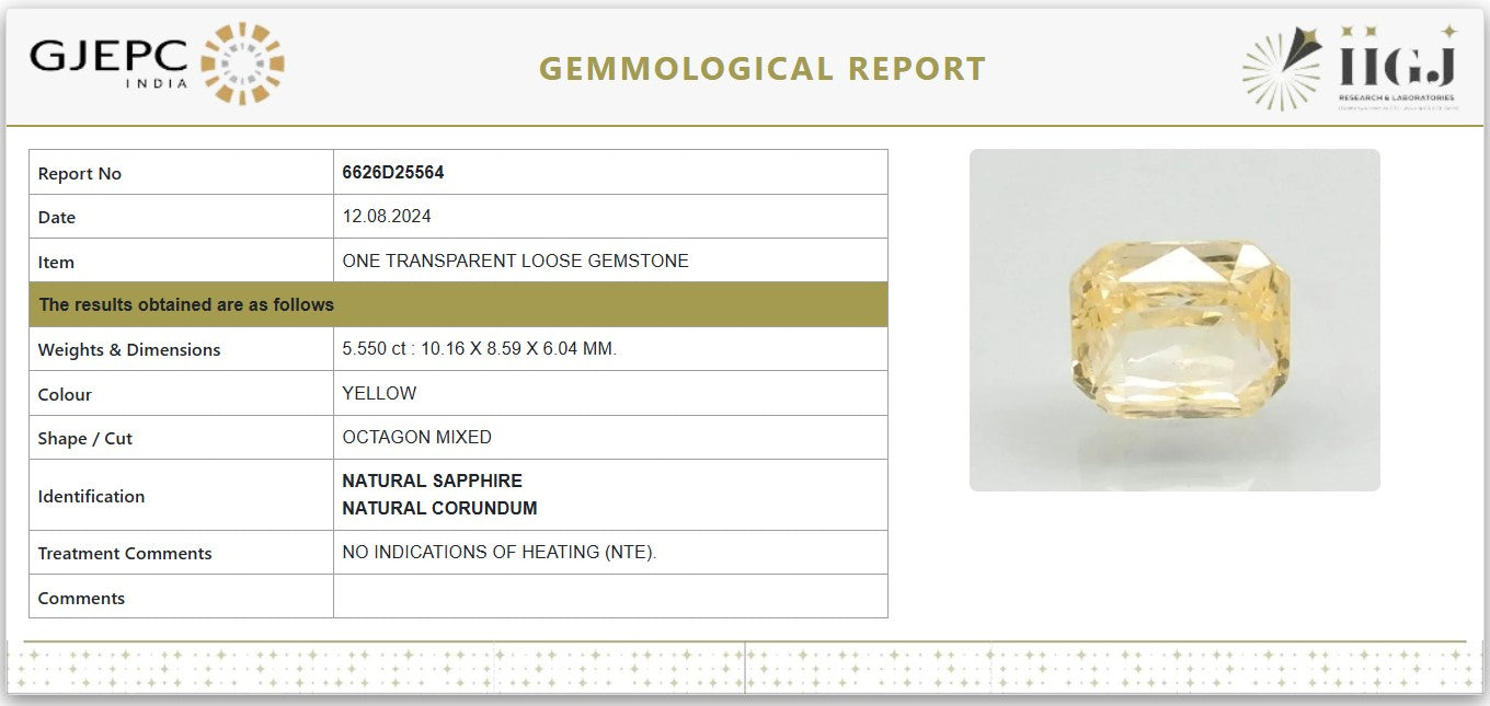 Enhance your fortune and elevate your style with this stunning 5.55 Carat (approx. 6.17 Ratti) Natural Yellow Sapphire (Pukhraj), certified by IIGJ Research & Laboratories under GJEPC India. This gemstone is completely natural with no heat treatment, making it ideal for astrological benefits and gemstone connoisseurs.