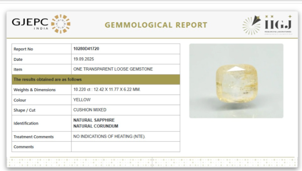 Certified by the IIGJ – GJEPC India, a Government-authorized gemological laboratory, this Yellow Sapphire is 100% natural and untreated, with No Indications of Heating (NTE). Unheated sapphires like this are rare and prized for their originality, making them an excellent choice for Vedic astrology.