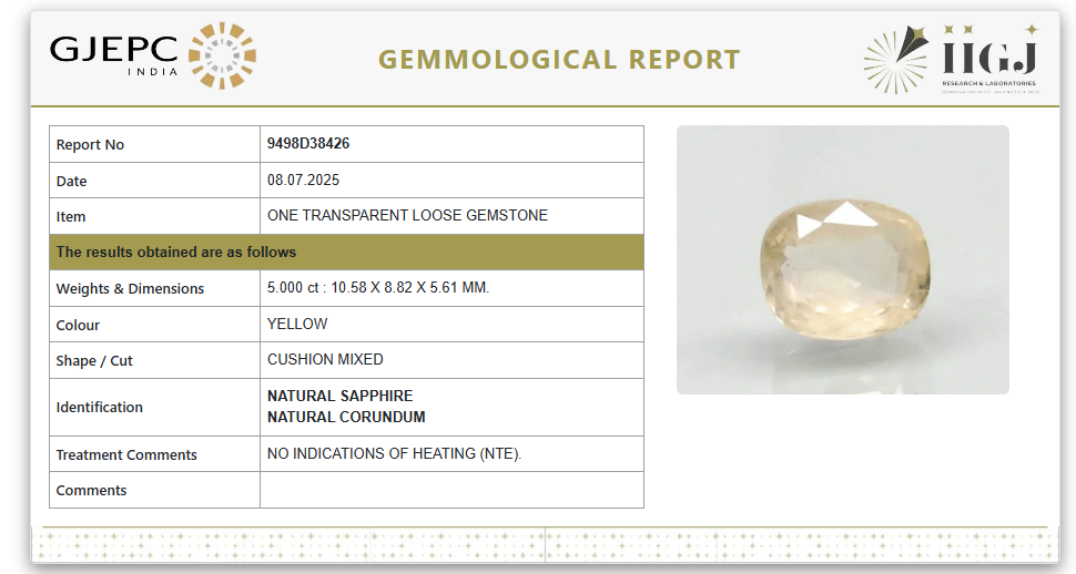 Discover the brilliance of this 5.56 Ratti (5.00 carats) Natural Yellow Sapphire (Pukhraj) — a vibrant yellow gemstone known for its astrological significance and natural purity. Ideal for Jyotish use, this sapphire is 100% natural with no heat treatment, preserving its original energy and charm.