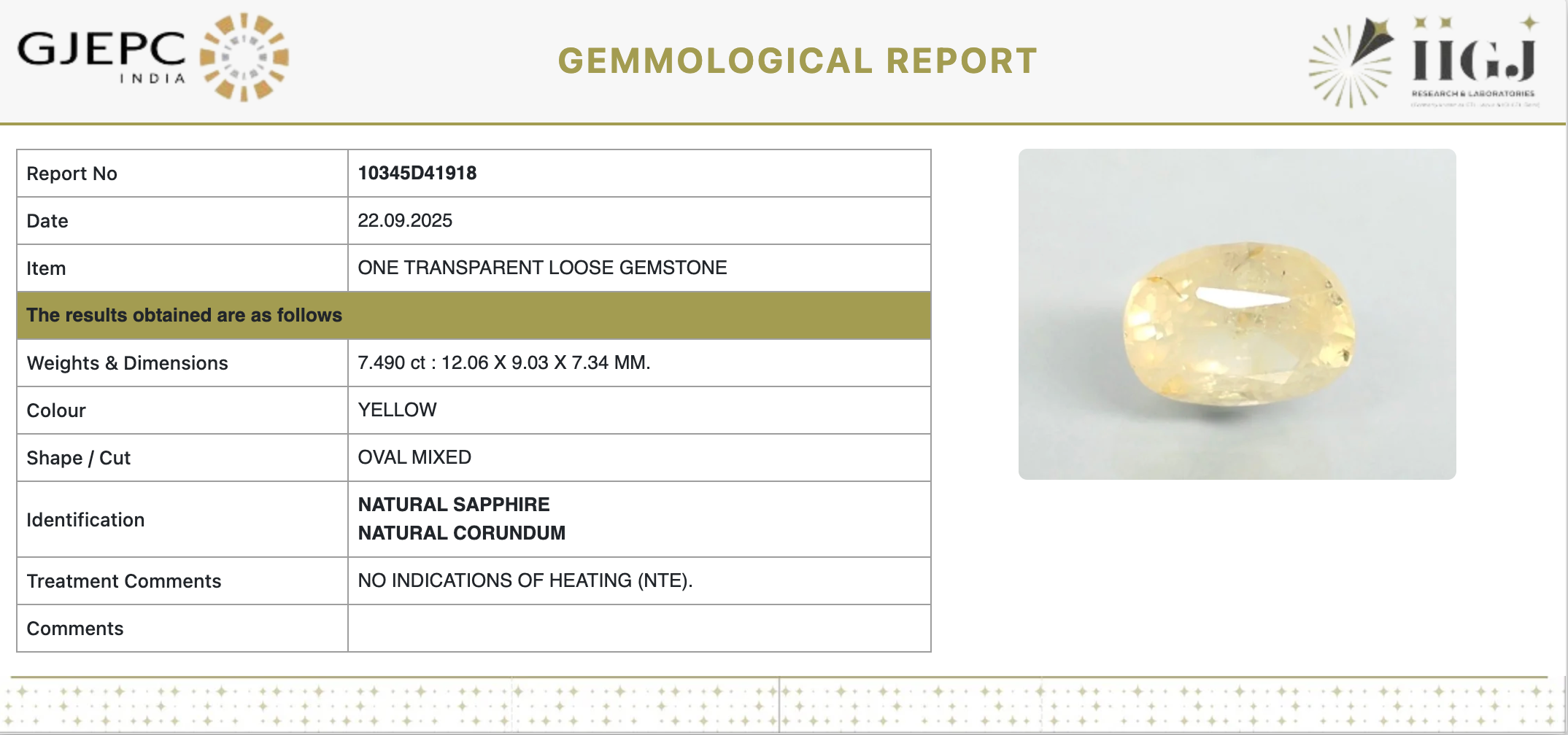 Discover the brilliance of this 8.32 Ratti (7.49 carats) Natural Yellow Sapphire (Pukhraj) — a vibrant yellow gemstone known for its astrological significance and natural purity. Ideal for Jyotish use, this sapphire is 100% natural with no heat treatment, preserving its original energy and charm.