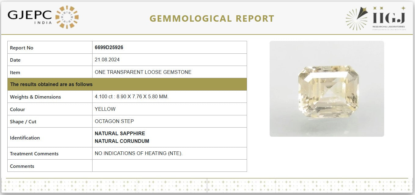 Natural Yellow Sapphire (Pukhraj) – 4.100 Carat / 4.56 Ratti – Certified Untreated | Report No. 6699D25926