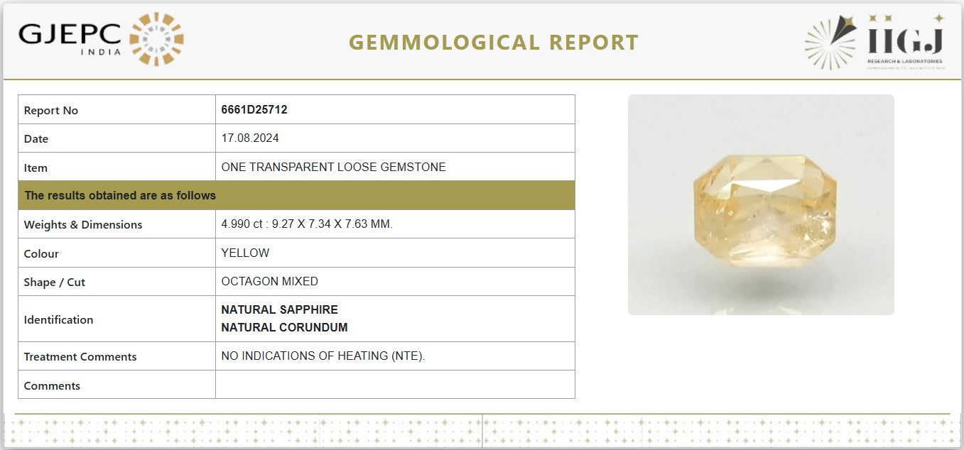 Description: Introducing a premium-grade Natural Yellow Sapphire of 4.990 carats (approximately 5.55 ratti), meticulously crafted in an elegant octagon mixed cut. This gemstone displays a subtle yet vibrant yellow tone, a symbol of wisdom, prosperity, and positivity.