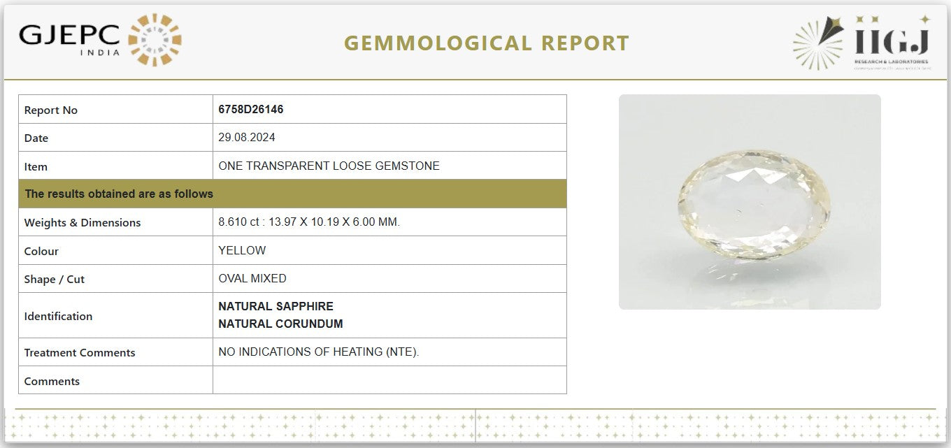 A stunning treasure from nature, this natural yellow sapphire exhibits a serene golden hue with excellent transparency and brilliance. Certified by IIGJ - GJEPC India, this gemstone is cut in a classic oval mixed shape, radiating timeless charm and astrological potency.