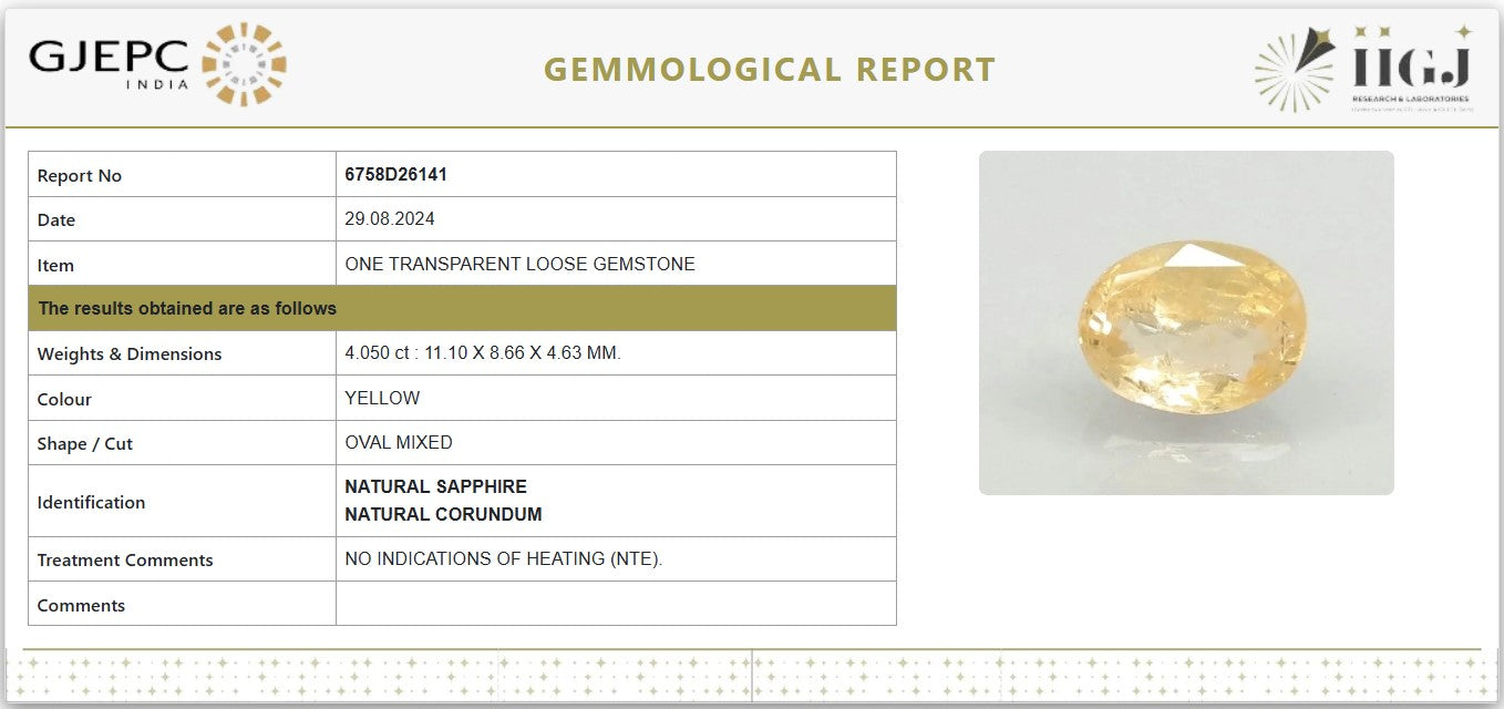 Certified Natural Yellow Sapphire (Pukhraj) – 4.05 Carat / 4.50 Ratti | Untreated | Oval Mixed Cut | GJEPC IGJ Certified | 6758D26141