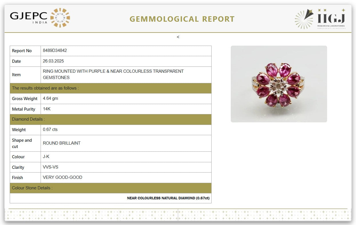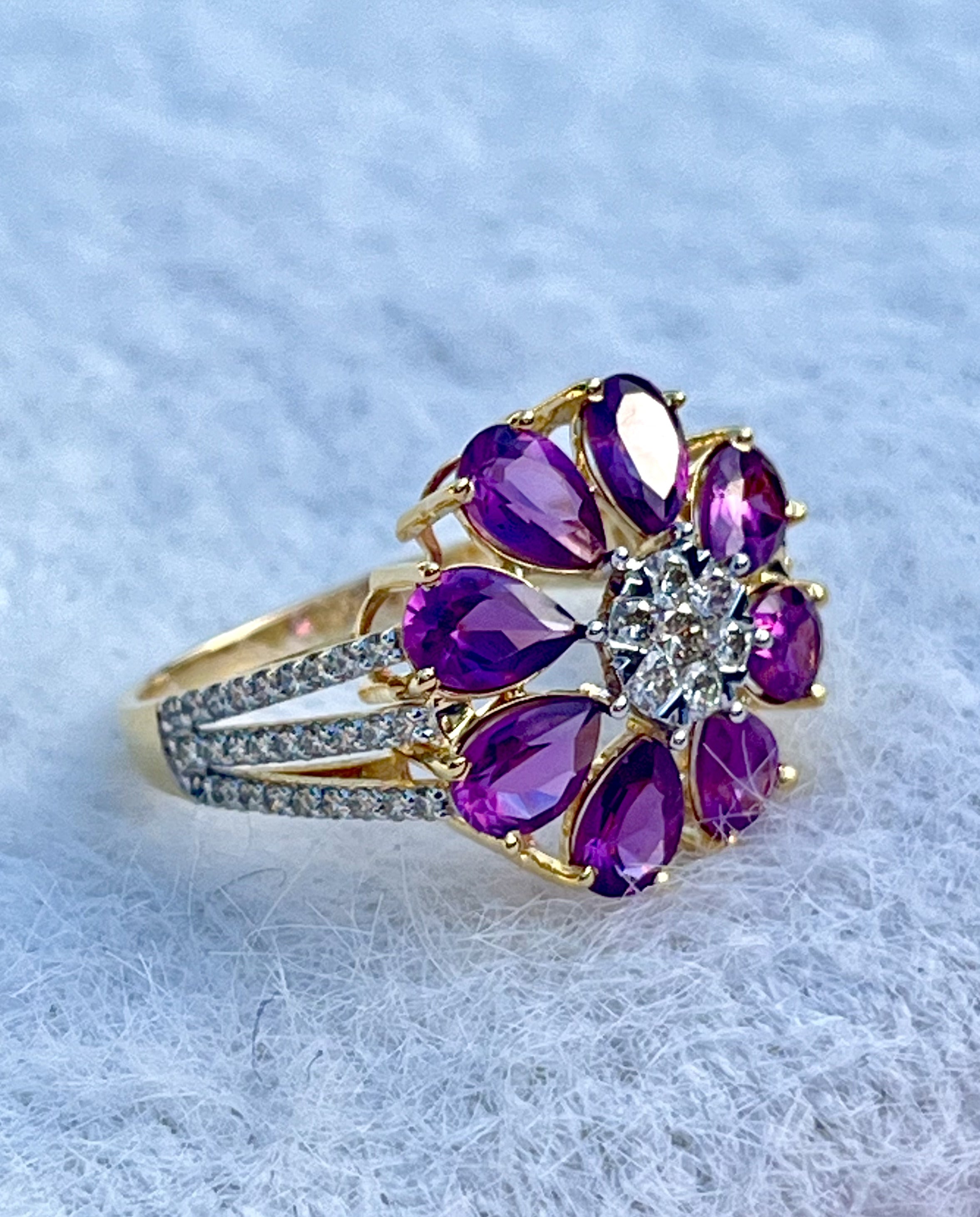 A perfect choice for those who appreciate the beauty of nature-inspired designs, this Natural Rhodolite & Diamond Flower Ring is a luxurious addition to any jewelry collection, ideal for special occasions or as a cherished gift.