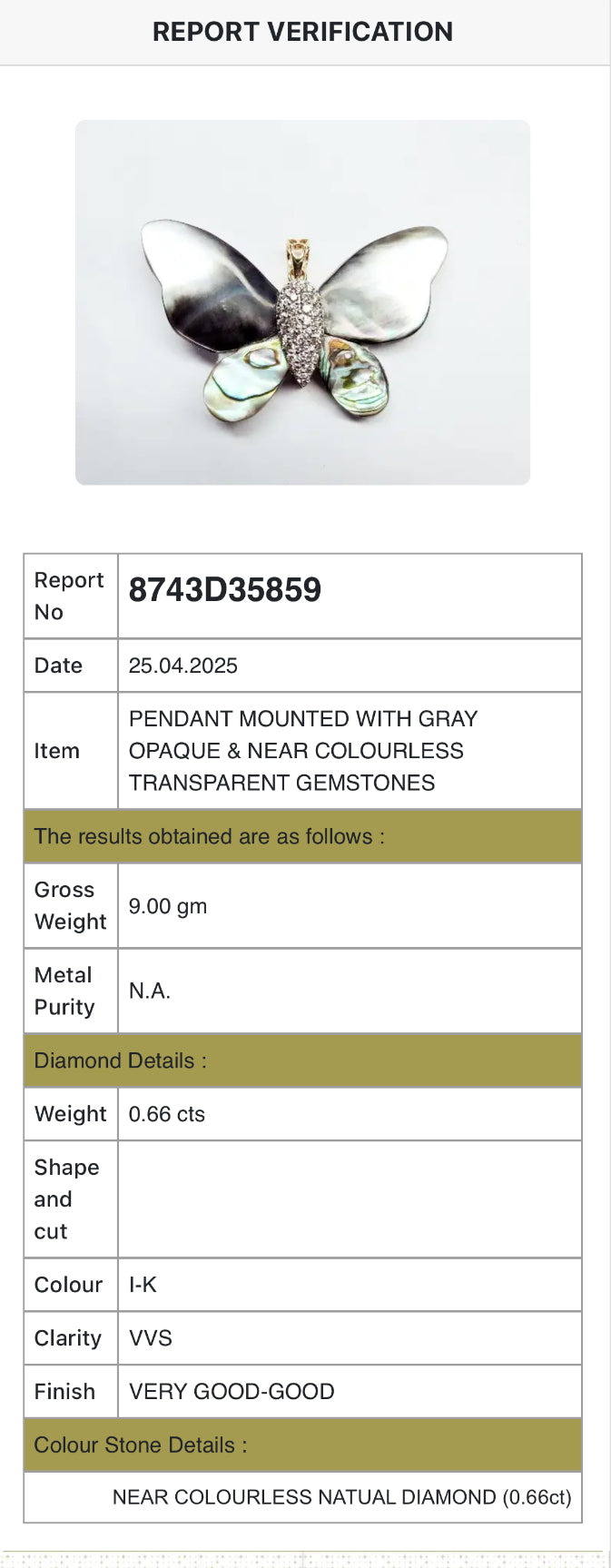 The body of the butterfly is adorned with 0.66 carats of near-colourless natural diamonds (I–K colour, VVS clarity), adding shimmer and elegance to this statement piece. With a gross weight of 9.00 grams, this pendant strikes the perfect balance between lightness and presence.