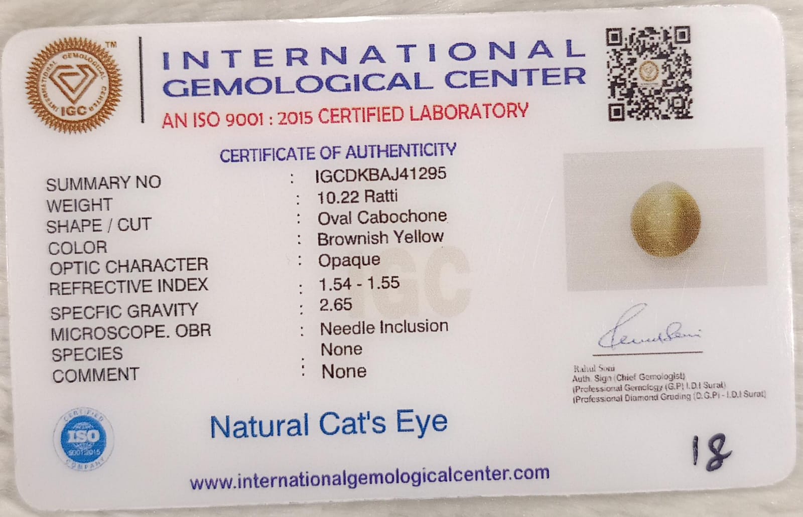 - Enhances Spiritual Awareness and Intuition Ketu is associated with spiritual growth, enlightenment, and detachment from material desires. Wearing a 10.22 Ratti Natural Cat’s Eye can enhance one’s intuitive abilities, promote meditation, and lead to spiritual awakening. It is especially beneficial for individuals seeking deeper insight, self-discovery, and inner peace.