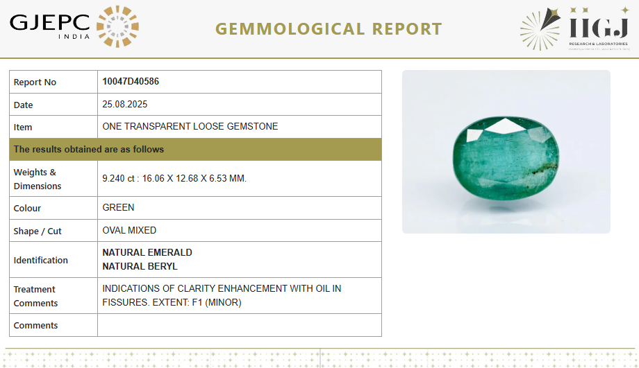 This Natural Emerald, weighing 9.24 carats, is a premium-quality gemstone certified by IIGJ Research & Laboratories (under GJEPC India). Featuring a vibrant green hue and an oval mixed cut, this stone reflects superior craftsmanship and authenticity.