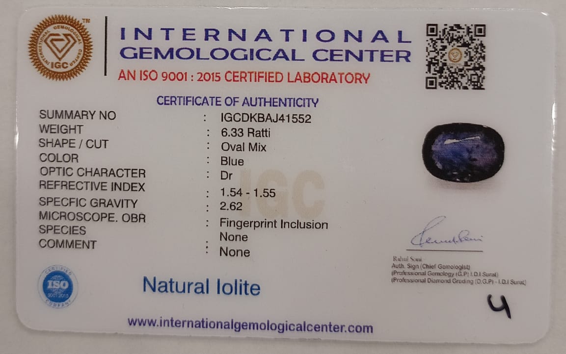 This striking Natural Iolite gemstone weighs 6.33 Ratti and is cut in a classic Oval Mix . Known for its deep blue hue . It is certified for authenticity and contains natural inclusions, affirming its genuine origin.