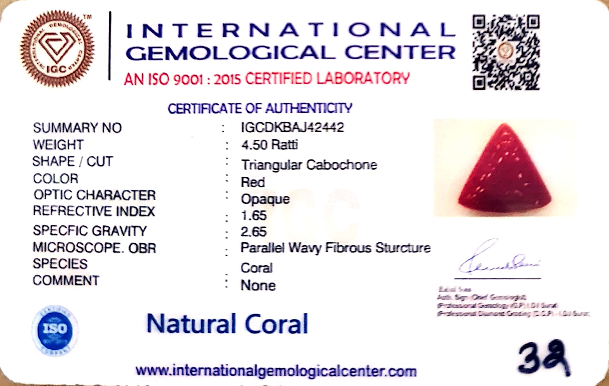 Introducing a Natural Red Coral weighing 4.50 Ratti (4.05Carat), lab-certified by the International Gemological Center (IGC). This gem features a traditional Triangular Cabochon shape with a vibrant red color and completely untreated composition.