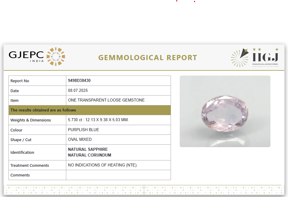 Certified by GJEPC India (Report No. 9498D38430), this gemstone is 100% natural corundum and shows no signs of heating (NTE), ensuring authenticity and high gem quality.