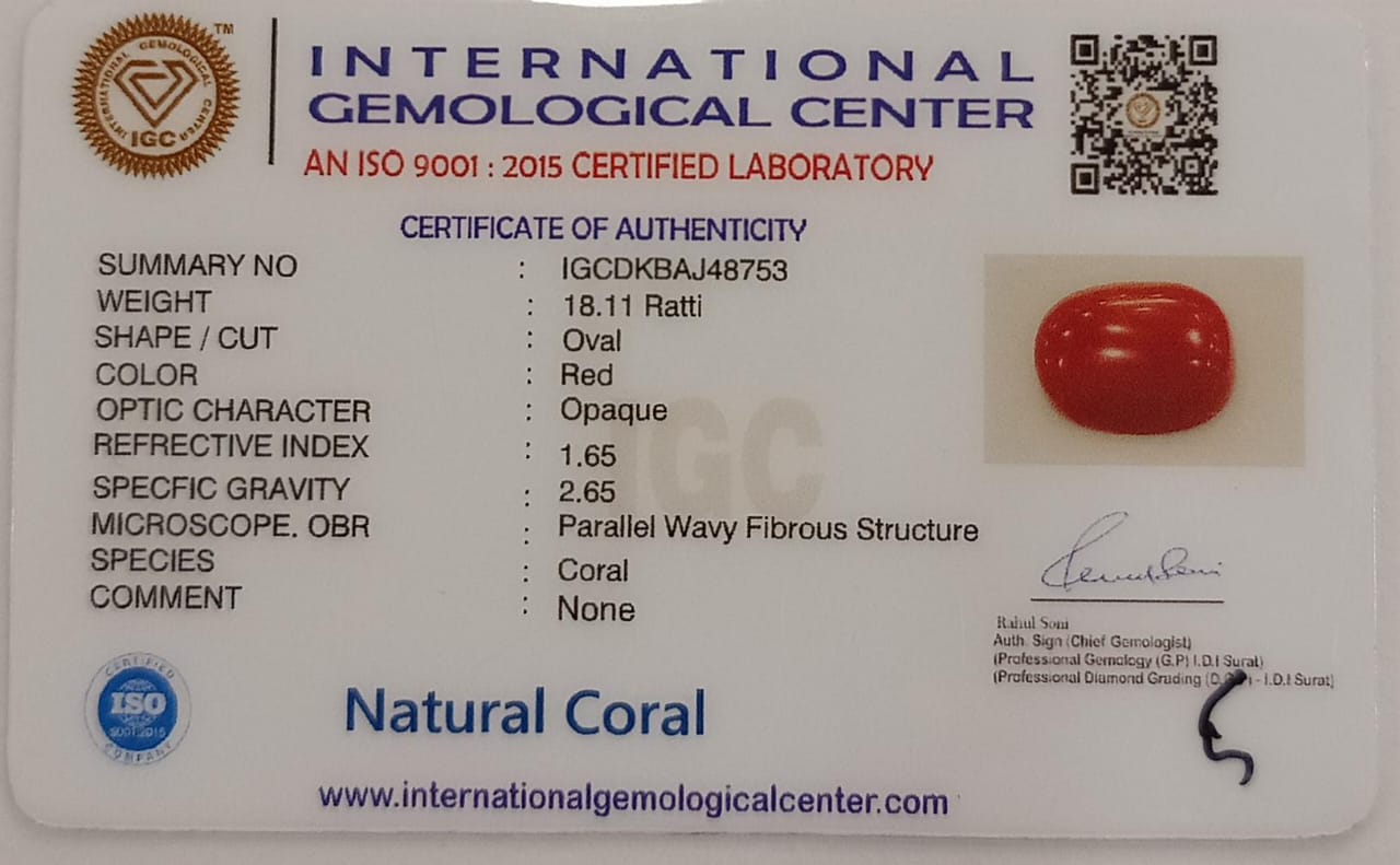 This Natural Red Coral, weighing 18.11 Ratti (16.30 Carat), is a certified gemstone ideal for astrological and spiritual benefits. With a Oval cut and a rich red hue, this coral is 100% natural and untreated, verified by the International Gemological Center (IGC).