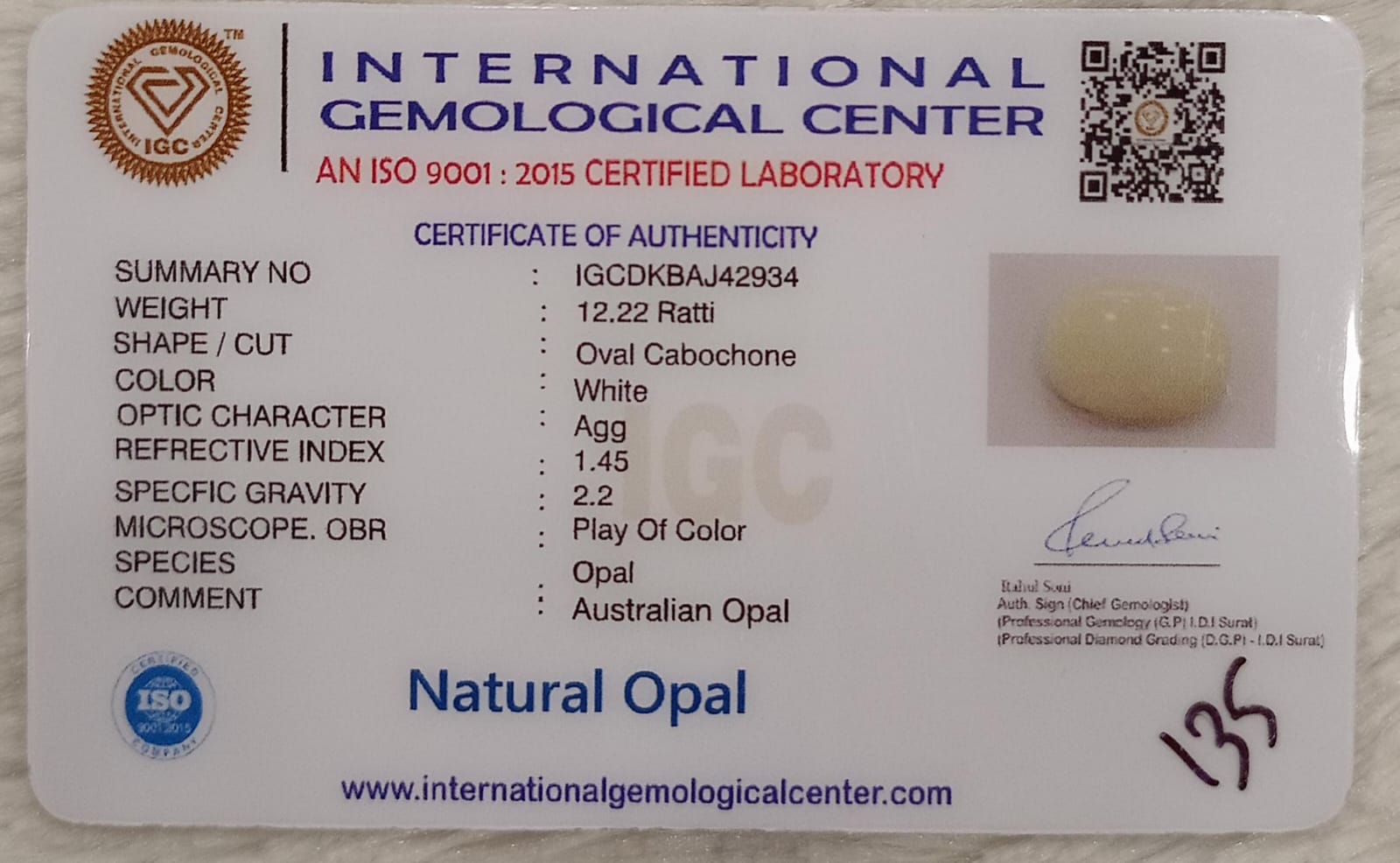 This exquisite Natural White Opal, weighing 12.22 Ratti (approx. 11.00 carats), is crafted in a graceful Oval Cabochone shape. Featuring a soft white hue and luminous body, this gemstone is ideal for fine jewelry and Vedic astrology. It is untreated, 100% natural, and comes with an certificate for quality assurance.