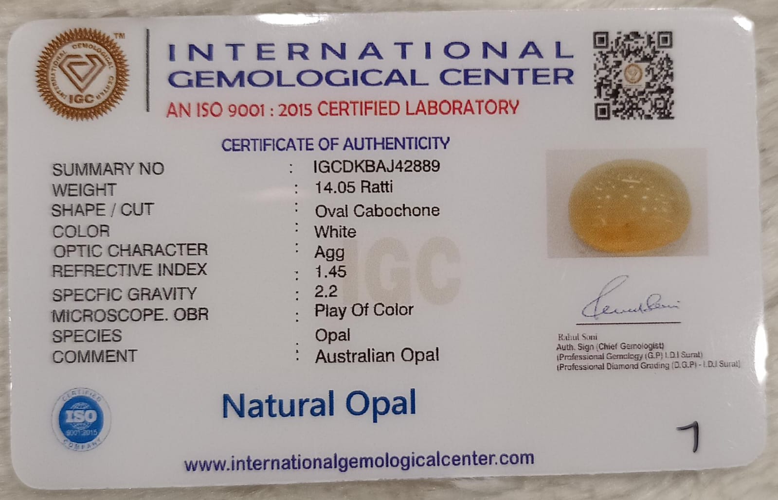 Natural White Opal 14.05 Ratti | Oval Cabochone | Certified No. IGCDKBAJ42889