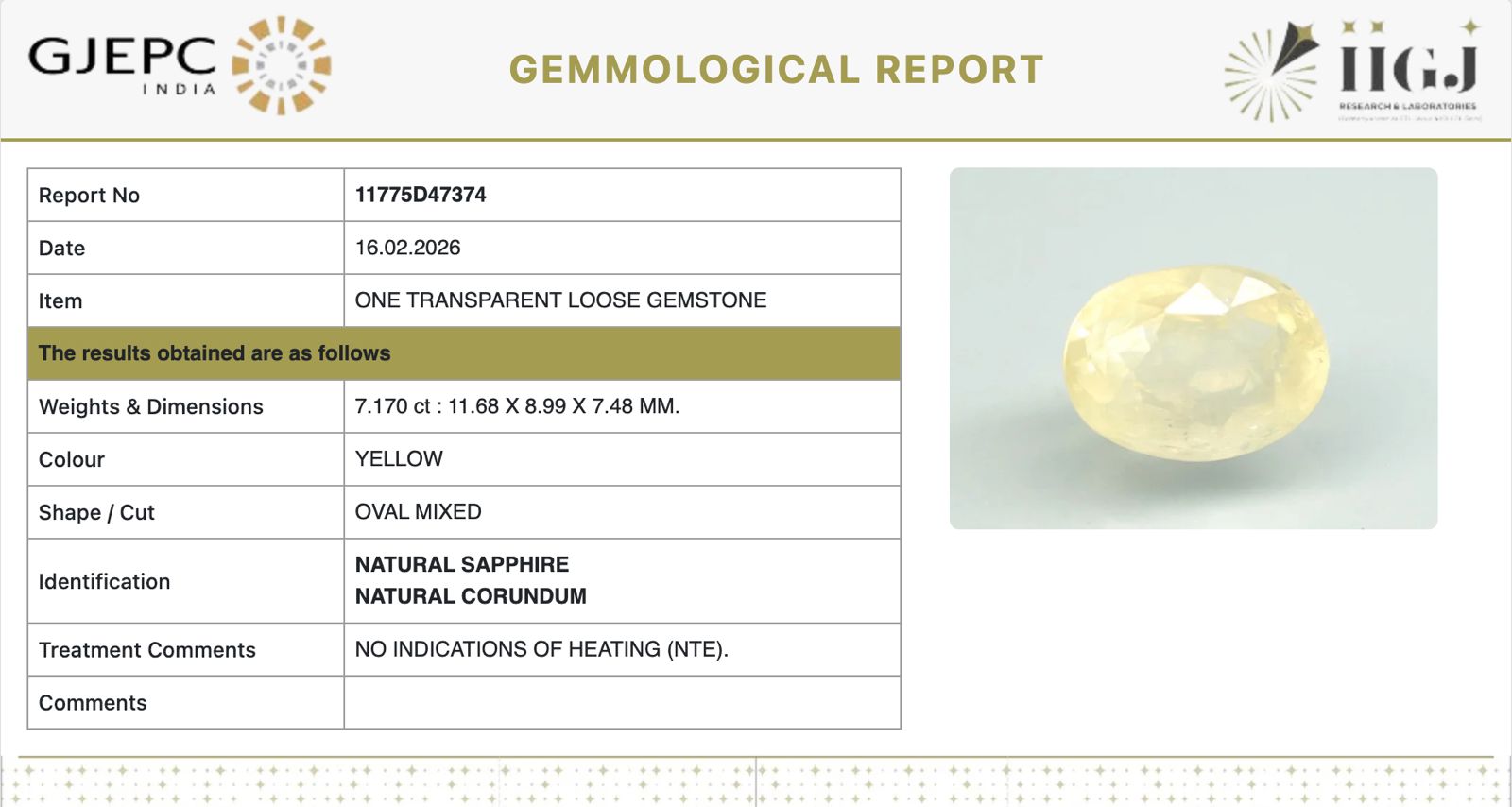 Natural Yellow Sapphire | Oval Mixed | Transparent | Govt. Lab Certified | Report No. 11775D47374