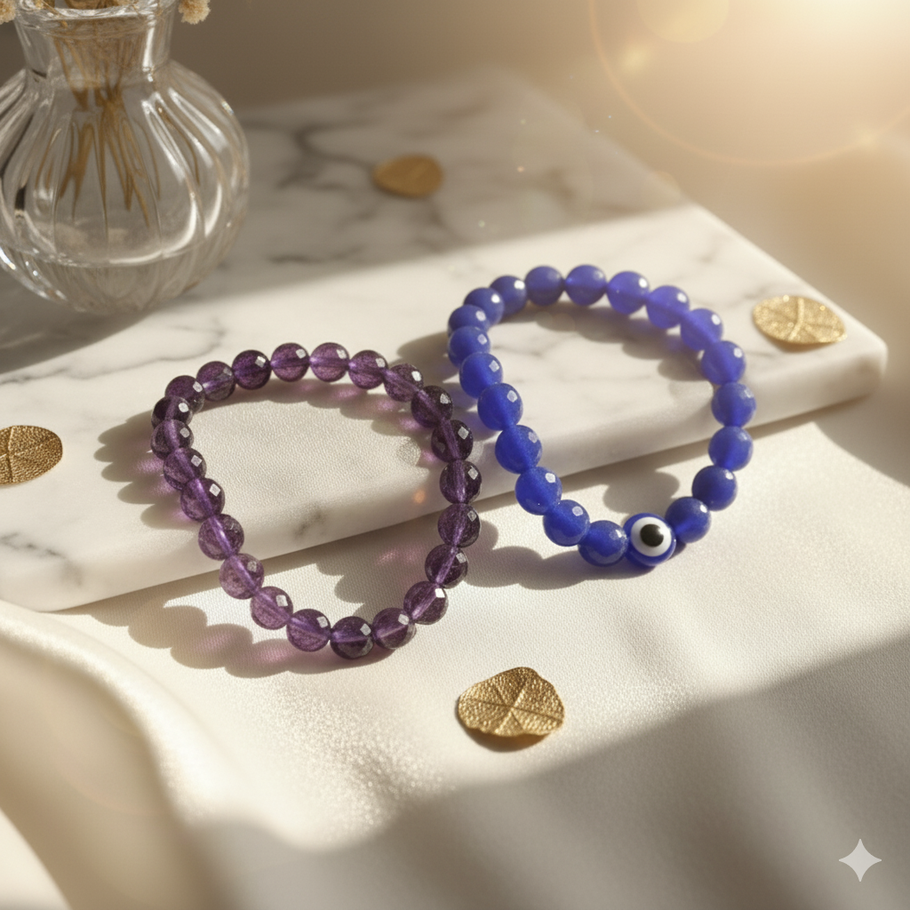 PURPLE BRACELET & BLUE QUARTZ WITH EVIL EYE BRACELET SATURN ENSURES SUCCESS