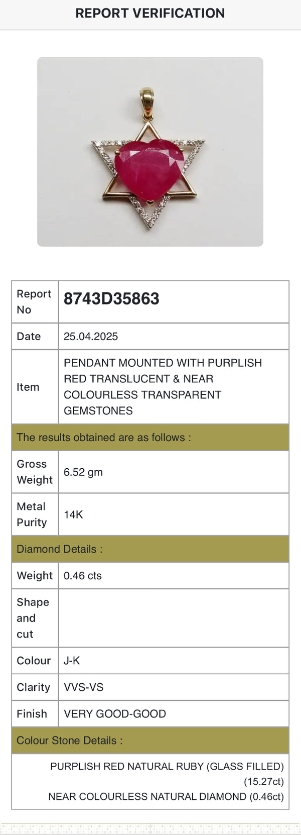 At the center lies a vibrant 15.27 carat heart-shaped purplish red natural ruby, artfully glass-filled to enhance its rich hue and translucency. This radiant gem is gracefully cradled within a Star of David–inspired pendant frame, encrusted with 0.46 carats of near-colourless natural diamonds (J–K colour, VVS–VS clarity) that bring sparkle and harmony to the design.