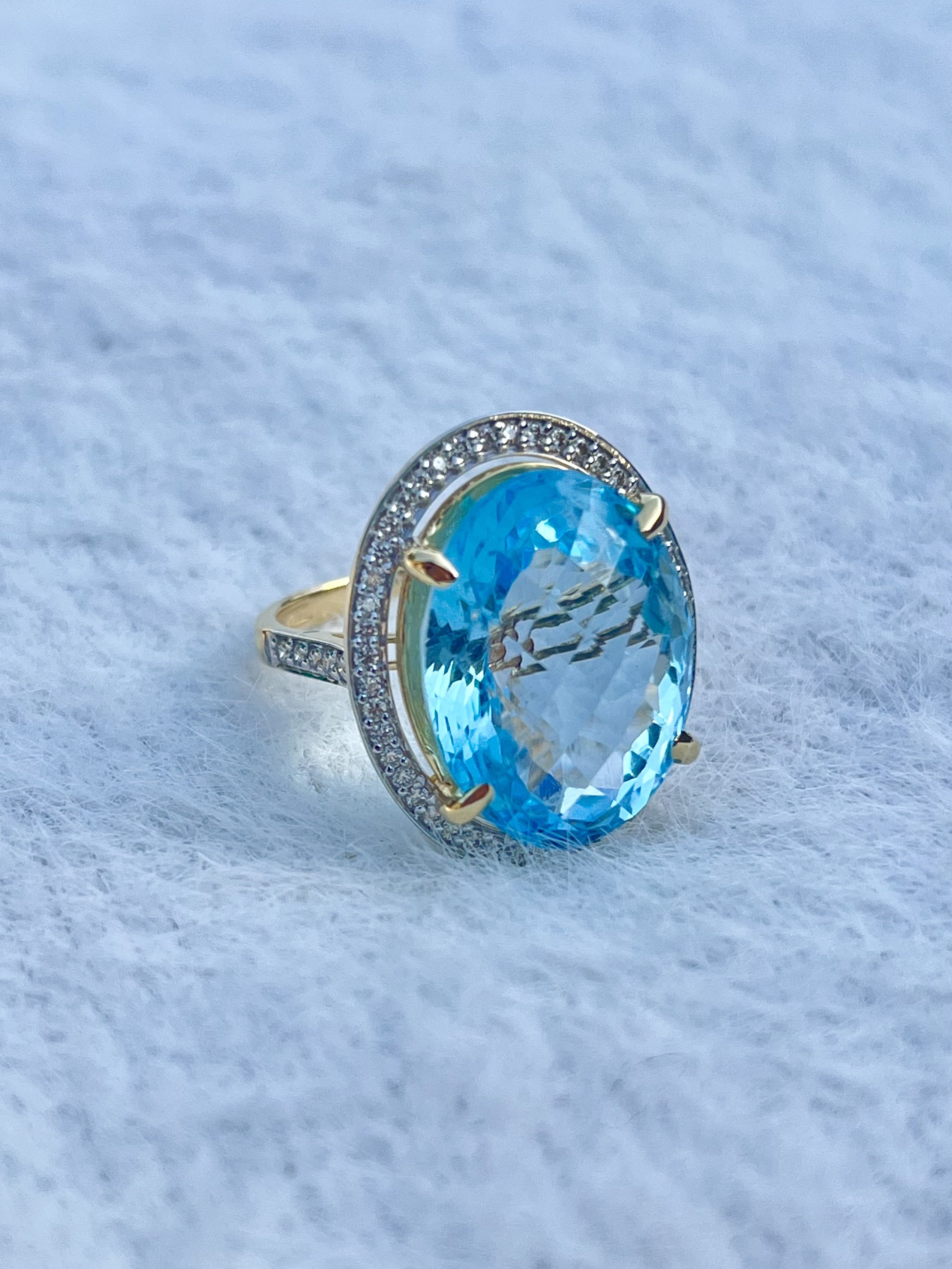Stunning Natural Oval Shape Blue Topaz & Diamond Cocktail Ring in 14K Gold